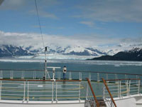 As you approach Hubbard Glacier, you have no idea of its actual size. There are no landmarks to help with the scale. The face of the glacier seen in the pictures spans 6 miles with Russell Fjord poking out at the right side. The ship approached slowly through an ice field for about an hour before turning broadside to the glacier about a half mile from the face. It was then we realized that our 150 foot tall ship was dwarfed by the 300 foot face of this massive ice wall. As it "calved", the sound of the ice crashing into the water was like thunder. It's hard to imagine a thousand people staring at ice for almost three hours!